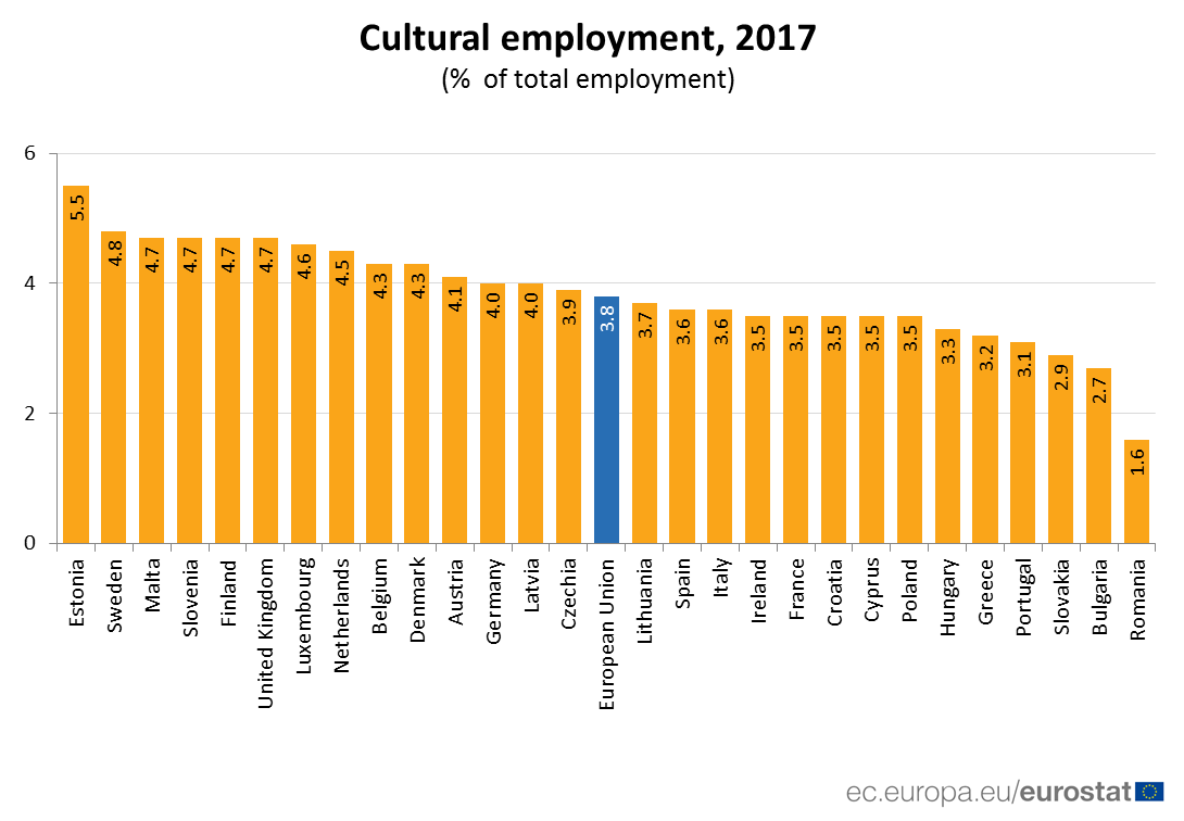 Nei singoli paesi, la percentuale di persone impiegate in cultura nel 2017 varia dall’1,6% in Romania a oltre il 5% in Estonia. I paesi dell’EFTA (Islanda, Svizzera e Norvegia) presentano tutti percentuali superiori alla media UE, mentre i paesi candidati (Montenegro, Macedonia e Turchia) quote inferiori alla media UE.
